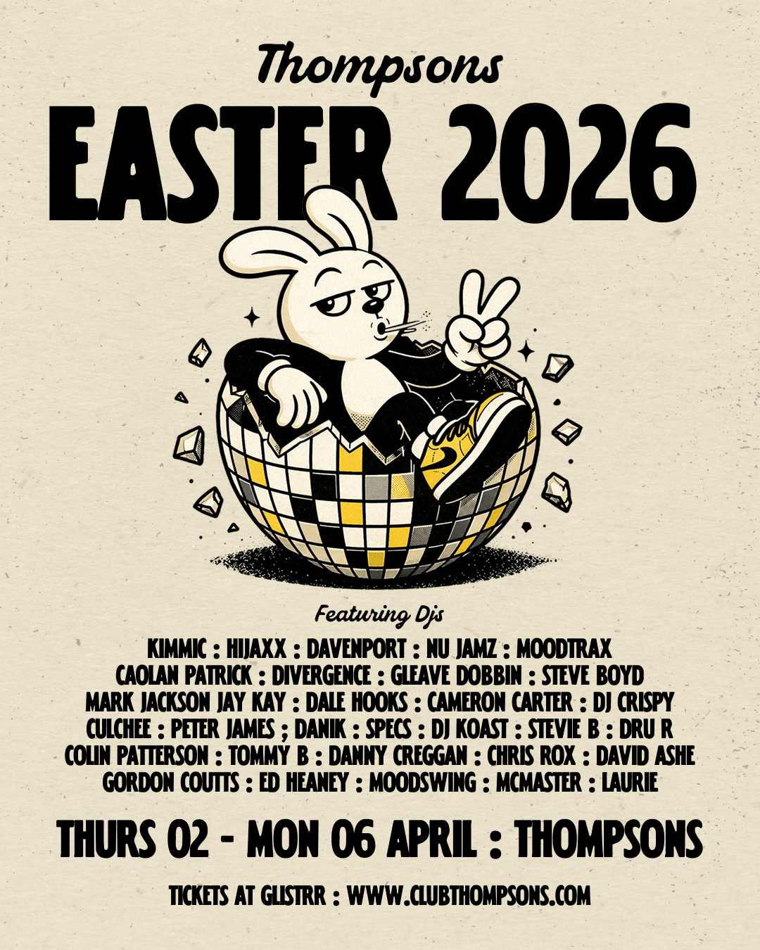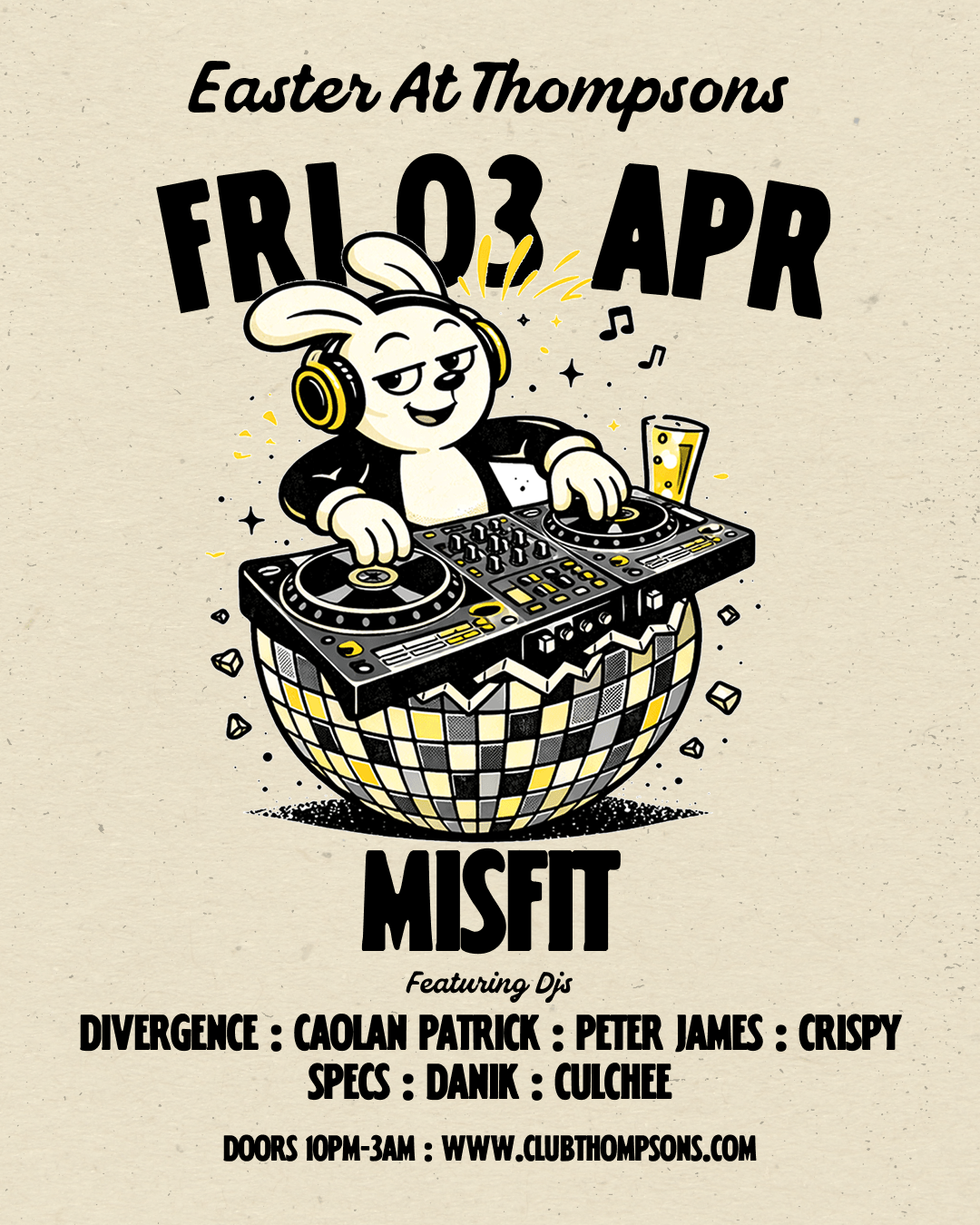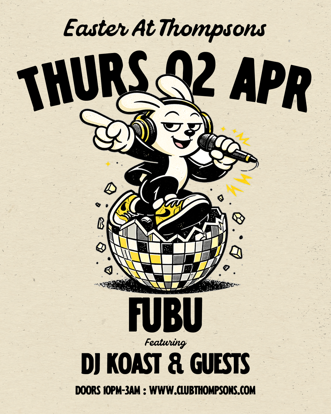 Thompsons takes over the Easter bank holiday with six events across five days. Getting things started on Thursday with FUBU leading into Good Friday's MiSFIT before a double-header on Easter Saturday with the Energy1 06 Day Rave and Stereo Sessions in the evening.