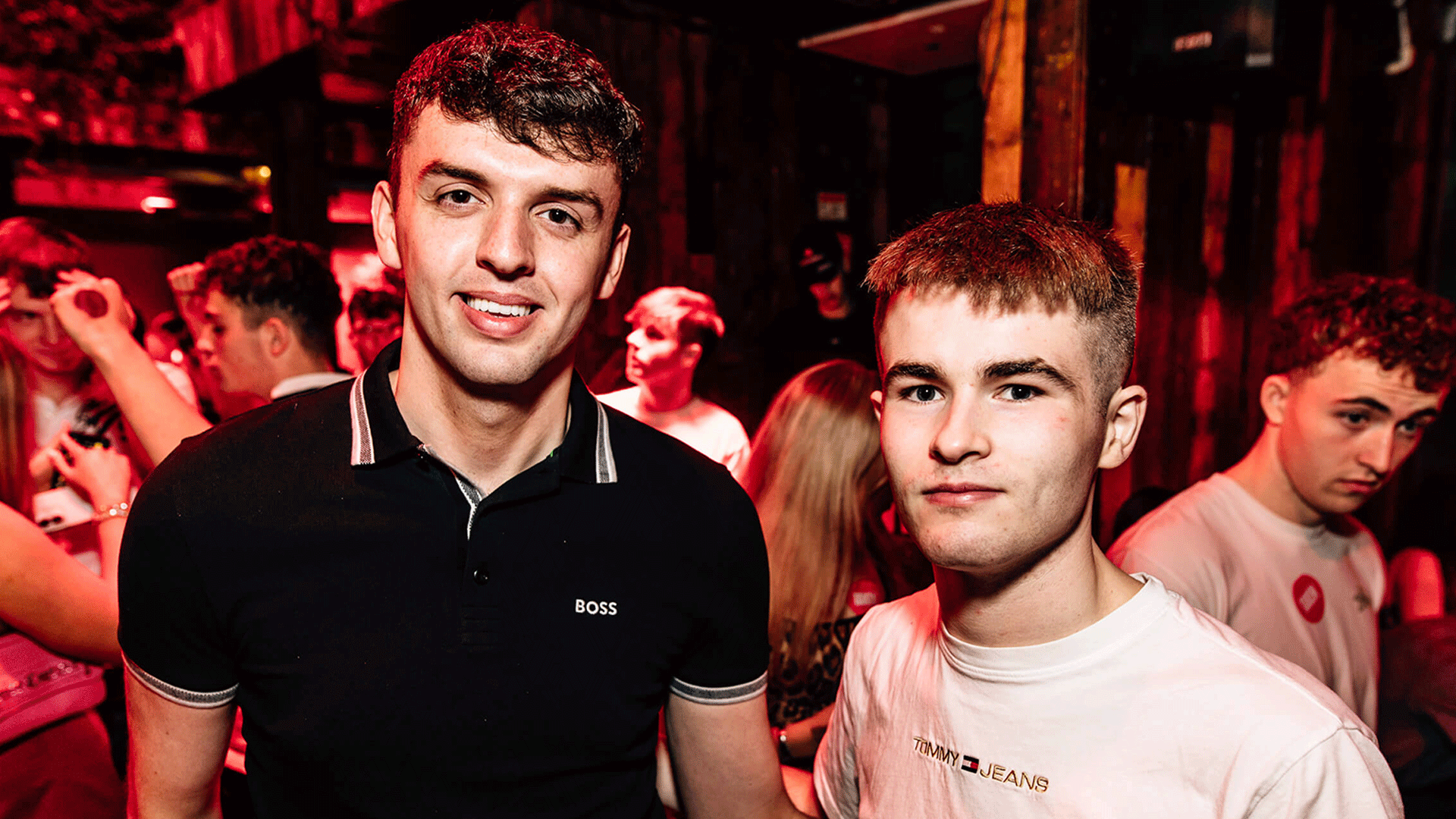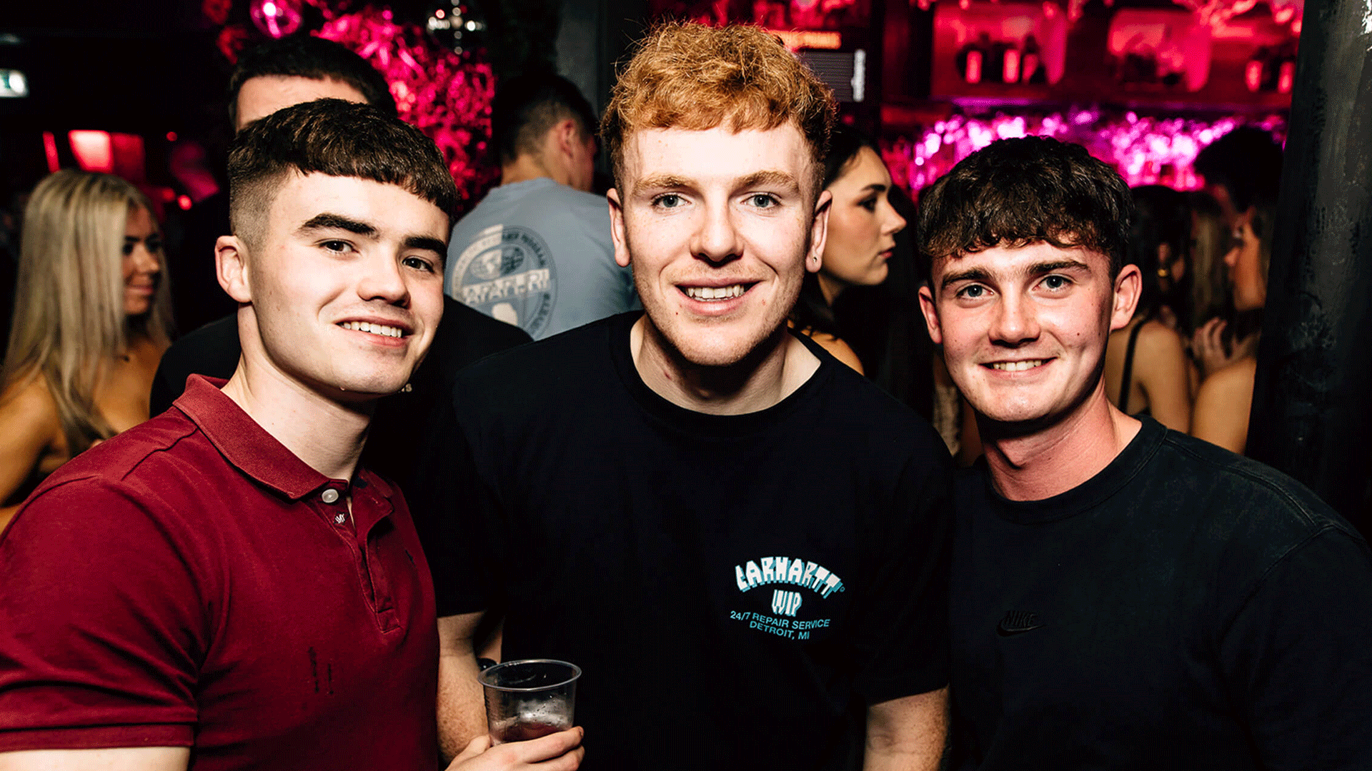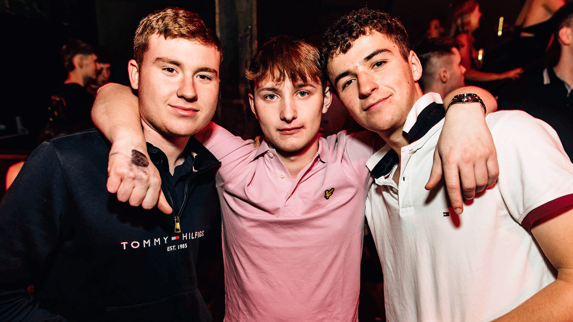Interior of Thompsons Garage, a Belfast Nightclub, featuring a vibrant atmosphere with purple and pink lighting. The nightclub includes seating areas, sound equipment, and a spacious dance floor, highlighting Belfast Nightlife and DJ events focused on House Music.